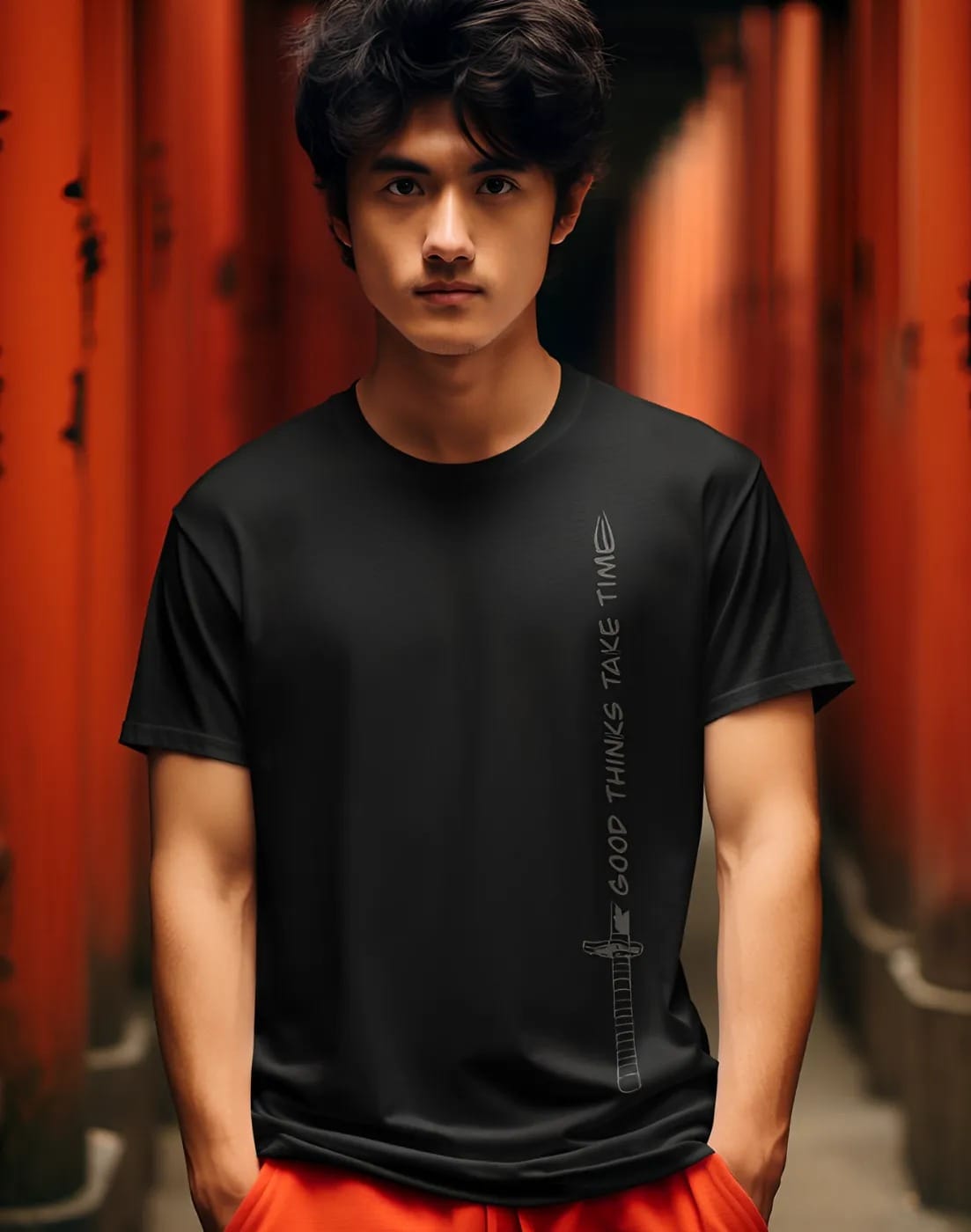 The vertical katana sword-inspired graphic paired with the quote βGood Things Take Timeβ symbolizes discipline, strength, and perseverance β making it more than just a t-shirt, but a mindset you wear. Perfect for everyday casual looks, gym wear, or street-style outfits, this tee blends comfort with attitude.
